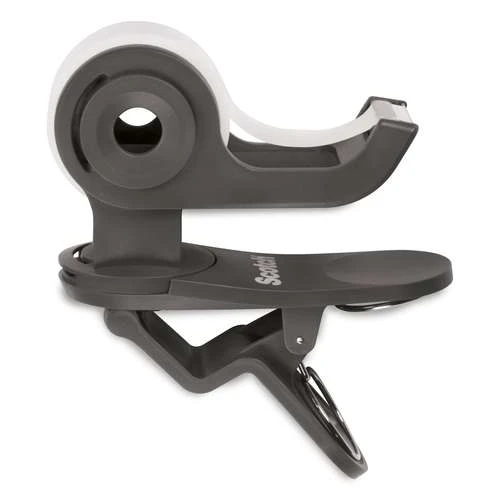 This Clip & Twist Tape Dispenser is very practical. It can be fixed to a table edge by means of the strong bulldog clip, and it rotates 360° around its axis, and 180° vertically.