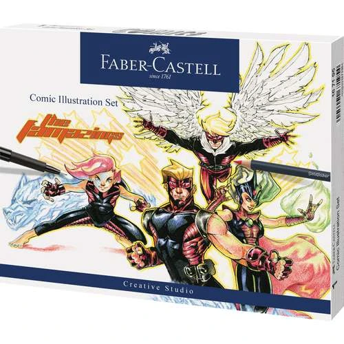 The Faber-Castell Comic Starter Set contains everything you need to get started with comic drawing: pencils for sketching, Pitt artist pens for outlines and Goldfaber crayons for colouring.