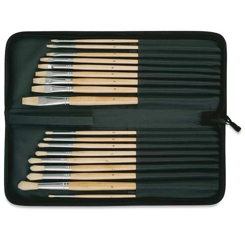 The brushes in this Gerstaecker Bristle Brush Wallet are sizes 1-8 and 10. They have long, clear lacquered natural wood handles with seamless silver ferrules.
