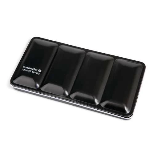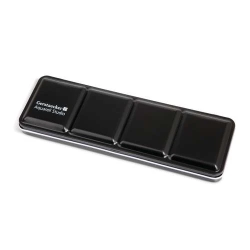 Gerstaecker Studio Watercolour Sets contain high-quality watercolour paint pans in matt black lacquered metal boxes with white glossy interiors. The boxes have 14 wells, 2 foldout palettes, a handy thumb ring and space for a brush.