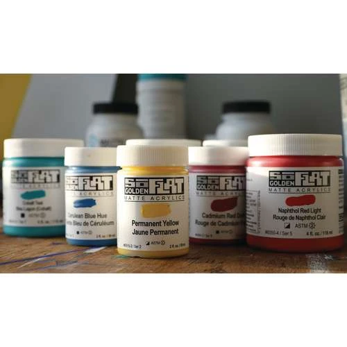 These Golden So-Flat Matt Acrylic Sets contain professional acrylic paints that dry extremely matt and opaque. They are self-levelling, leave no brush marks and, after drying, have the effect of a printing ink.