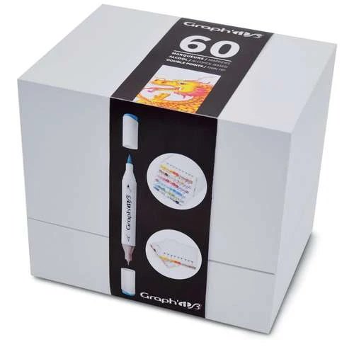 This Graph’It Brush Marker Set contains 60 double ended markers in an elegant recyclable and biodegradable white cardboard organiser box. It is a great gift for students or experienced artists, professionals, hobbyists or manga fans.