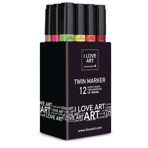 These I Love Art Twin Marker Sets contain 12 marker pens with 2 different tips: a 1mm fine point and a 2-6mm chisel tip. They are ideal for sketching, drawing and illustration.