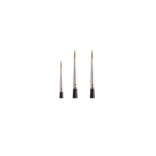 This Léonard Kolinsky Round Brush Set Series 7733RO contains sizes 4/0, 0 and 5. They have tips of selected Kolinsky red sable hair, brass ferrules and black lacquered handles with a grey finish.