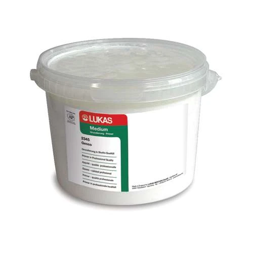 The Lukas Professional Quality Gesso Primer is ideal for oil, acrylic, tempera and gouache. It dries to a silk-matt surface and is waterproof after drying (drying time approx. 2 hours depending on the layer thickness). Lukas Professional Quality Gesso Primer is available in 2 litre tubs.