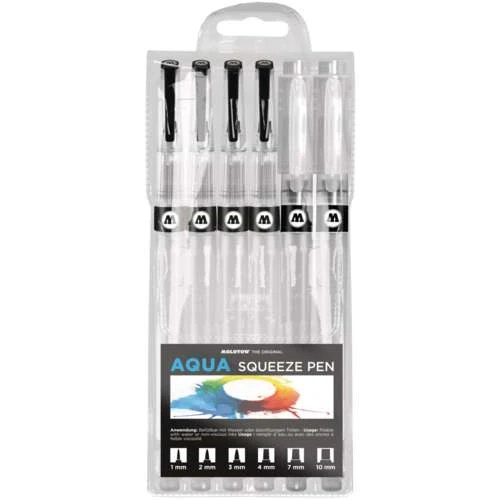 Molotow Aqua Squeeze Pen Sets contain either 3 or 6 pens that are easy to fill with water or low-viscosity ink for easy colouring.