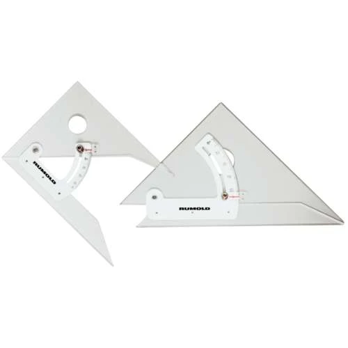 Rumold Adjustable Set Squares are transparent plexiglas isosceles triangles with an adjustable angle so the functions of an angle and a protractor can be combined.