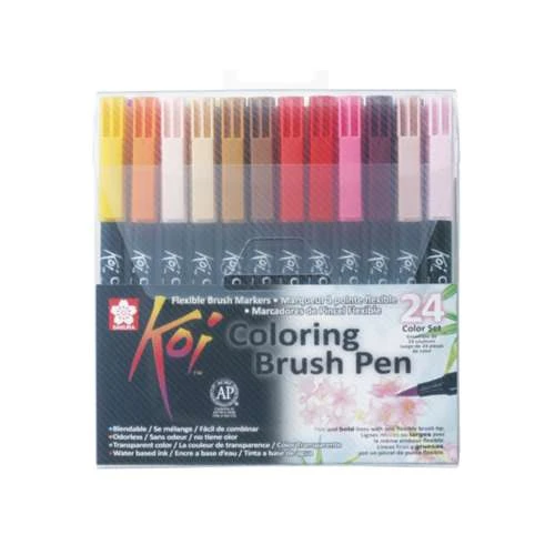 The dye-based transparent ink colours are easy to mix, allowing you to create a variety of colour tones and effects. The water-based odourless solvent ensures beautiful, subtle colour mixes and allows the design of different layers of paint. The pens in theSakura Koi Colouring Brush Pen Sets have flexible and remarkably sturdy nylon tips. The tips have the characteristics of an artist’s brush and spring back to their original shape after each brush stroke. Altering the pressure on the tip allows the drawing of fine and medium lines as well as wide-area painting.