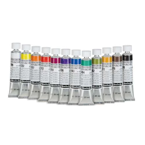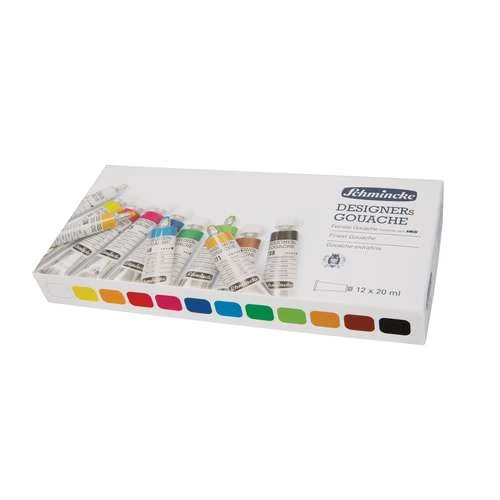 This Schmincke Designers Gouache Set consists of 12 x 20ml tubes of the finest artist paint presented in a cardboard box. They offer maximum coverage, intense colours and a velvety matt finish.