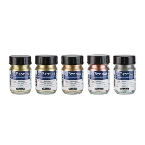 Schmincke Oil Bronze should be mixed 3 parts oil bronze to 2 parts binder and mixed with a palette knife. White spirit can be used to thin the mixture if necessary. Once dry, Schmincke Oil Bronze can still be removed with white spirit or turpentine. For particularly absorbent substrates, pretreat them first with some diluted bronze medium. Schmincke Oil Bronze is available in 50ml jars in different tones.