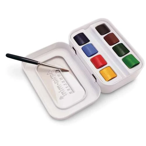 The high quality Sennelier Mini Aqua Box contains 8 half pans of Sennelier watercolour and a small brush in a practical, metal box with integrated palette.