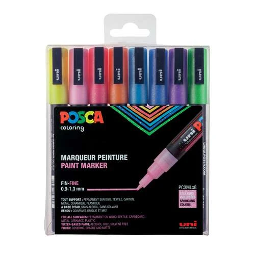 This Uni Posca Glitter Markers PC-3ML Set contains 8 markers with high opacity and light resistance. They are suitable for paper, cardboard, terracotta, plastic, metal, textiles, wood, ceramics, porcelain, concrete, stone, glass etc.